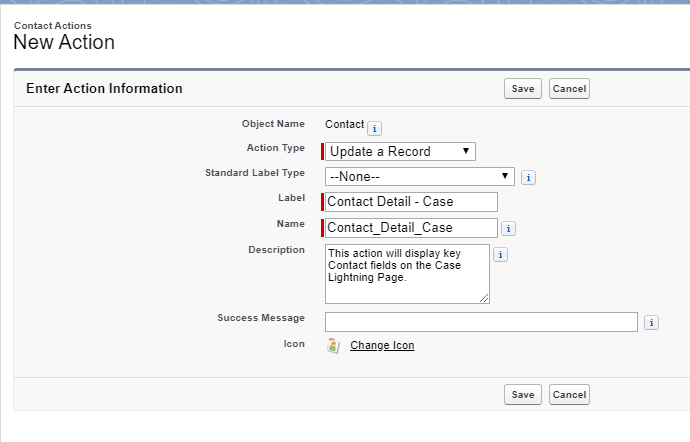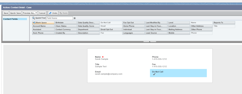 Choose your fields to include. I recommend working with your teams to ask: “When you navigate to the other record (account page, contact page, etc.), what fields are you looking for?” In my example below, I’ve chosen fields that the agent may need to use to reach this contact. In the full page photo above, you can see that I’ve chosen fields that specifically relate to a service agent’s normal actions.