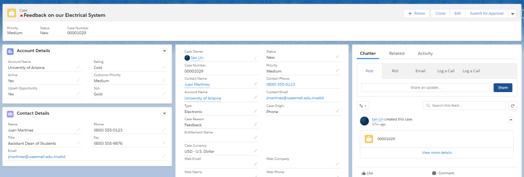 Reviewing this page as a whole from our service agent perspective, we can see key case details in the highlights panel at the top, giving our agent–or anyone else working with the customer–quick facts to get up to speed. In the center, full case details let us know what’s going on with the case so the customer can trust the information we have, and thus, trust us! On the right, a few tabs with a chatter feed, related lists, and activity stream, and finally, on the left, our related records! With this single view page, agents are ready to handle customer issues quickly, efficiently, and without extranneous action.