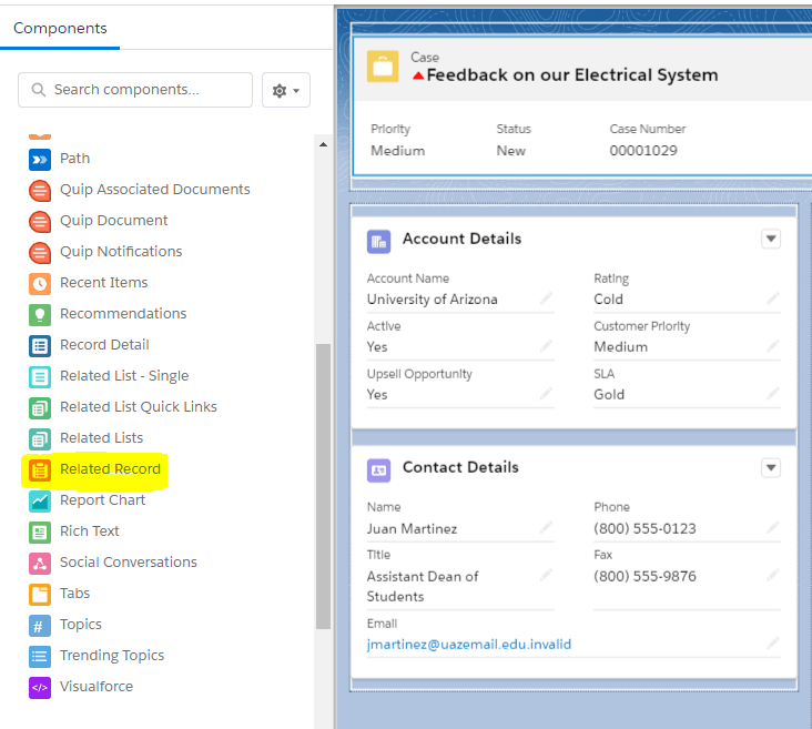 My favorite component for Lightning Pages is the Related Record component used on Lightning Record Pages. This component allows you to pull in an action you’ve created on either the record you’re viewing or any other record linked to the current one via a lookup field. And you can use these actions to either be a window to view your related record, or to highlight fields that need to be edited together for easy access!