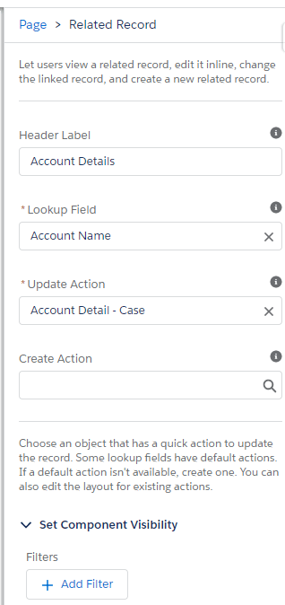 Another thing I love to do is play with component visibility. Maybe you want to make this component available specifically to profiles for service super-users. Or to account management teams whose function crosses multiple other teams. Or you can display the component based on information in your primary record itself. The formula’s the limit!